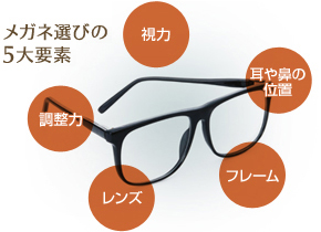 メガネ選びには、「視力」「調整力」「レンズ」「フレーム」「耳や鼻の位置」等、これらの要素を組み合わせることによって最良のメガネが選ばれるのです。