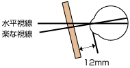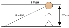 通常人が自然な状態でいるときには、ある一定距離の先に視線が行きます。この自然な状態の距離では、目の収縮筋力はリラックスしている状態ですので、丁度『休め』の姿勢に該当します。この『休め』の状態でレンズの傾斜角を決定していきます。