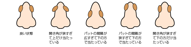 鼻パットの次は、テンプルです。フレームのちょうど後方部分に当たるこの箇所は、角度がきついと頭痛の原因となる事があります。下の図の上段一番右側がその状態になります。加えて、フレームが曲がりはじまる位置が早いと耳を圧迫しますし、メガネが浮き上がってしまいます。遅い場合は頻繁にメガネが下がってしまい、ストレスを感じてしまいます。早すぎず遅すぎない位置を見つける事が大切です。